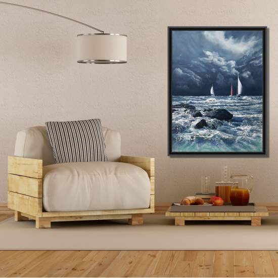 Peinture sur toile illustrant des voiliers en mer. Reproduction de grand qualité disponible en plusieurs formats et encadrements.