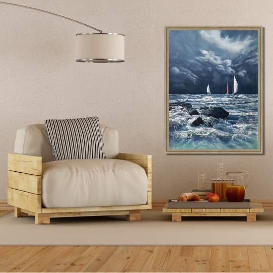 Peinture sur toile illustrant des voiliers en mer. Reproduction de grand qualité disponible en plusieurs formats et encadrements.